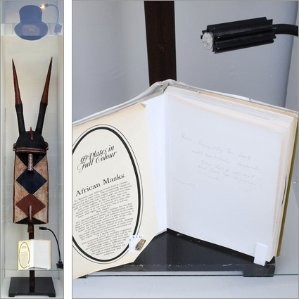 In Victorian at *QueenSpecific, curator and art collector Kenneth Montague highlights 3 pieces from his collection of objects. The hat, the mask and the book are all vintage items. The gentleman's top hat (England, c.1900) was worn as a social signifier and fashion statement; it hangs above a Bobo helmet mask (Burkina Faso, c.1900) that was employed in traditional ceremonies. The book African Masks (first edition; Paul Hamlyn Publishers, London) is a translated version of the original text by Italian writer Franco Monti. Although it is a 1969 publication, the editor's language suggests a decidedly Victorian viewpoint.