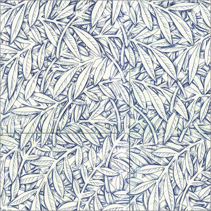 Undertow is made up of 40 individual drawings that work together to form one large piece. It was created with the most basic writing/drawing tool – a blue ballpoint pen from a stationary store. The work refers to doodling, the urge to fill the page and the need to fill time. Undertow was produced over a year in which Koken used only one single, simple decorative unit – a curved stem with leaves – over and over again. By overlapping (and underlapping) Koken wanted to create overloaded walls of pattern, arranged to fill the *QueenSpecific window with chaotic natural beauty that is at once impenetrable and inviting. |