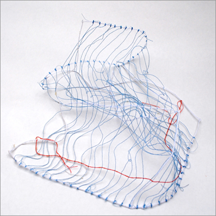 Amanda is interested in looking at thread as line. Her thread replicas of notebook paper expose the blue and red marks by removing the white of the paper. Flat sewn lines ave been crumpled exposing their folds, tangles and slumps. These crinkled scraps of paper represent scrapped ideas, or happy accidents. Amanda will be purchasing more notebook paper when she goes back to school this fall at Tyler School of Art in Philadelphia, PA. She anticipates many scrapped ideas in her upcoming academic pursuits. Website design by Stareatjello Design. |