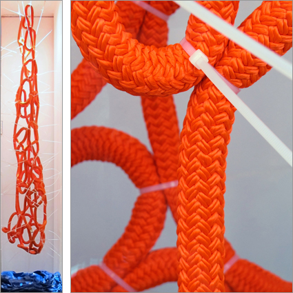 The activity of tying one cable tie to another, or conversely a plastic tie to nylon rope, until something familiar emerges is at the core of Svava Thordis Juliusson’s installation, Leifar/Remnants, at *QueenSpecific. A connection to Juliusson’s country of birth figures strong in her work – titles often come to her in Icelandic, while the aesthetic considerations are drawn largely from the colour, shape and texture of the landscape. Conceptually, Juliusson aims to explore the ubiquitous nature of plastic, and how it manifests as a part of natural and domestic environments. |