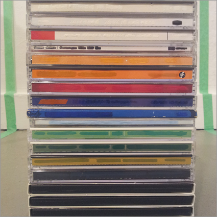With Redacted Stack, made specifically for *QueenSpecific, Eleanor King continues a practice that gleans from consumer waste as material and combines these found objects into minimal architectural forms. Her collections exploit the inherent structural properties of the object while simultaneously maintaining the potential of failure. Her work speaks to cultural production, excess and obsolescence, and her relationship to music is often embedded through repetition, pattern, and the very media in which music is delivered. |