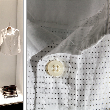 A cotton shirt, originally made by an anonymous worker, was disassembled at the seams into its twenty-one component parts and each piece run through a typewriter. The period key was pressed over 20,000 times to create a polka-dot pattern, hand-typed directly onto the fabric. Once printed, the pieces were hand-sewn back together. At first glance, the pattern may appear industrially printed, though on closer inspection mistakes can be glimpsed; an accidental “m” or misaligned row. Hand-typed Polka-Dot Shirt explores the relationship between the hand-made and machine-made by misusing a machine designed to accomplish one kind of task, to achieve another that it is quite unsuited for.